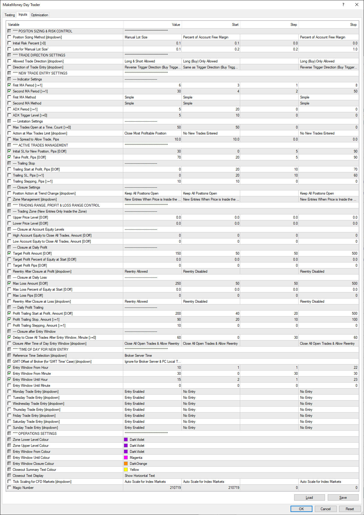 Historic Best Settings Analysis for MakeMoney Day Trader