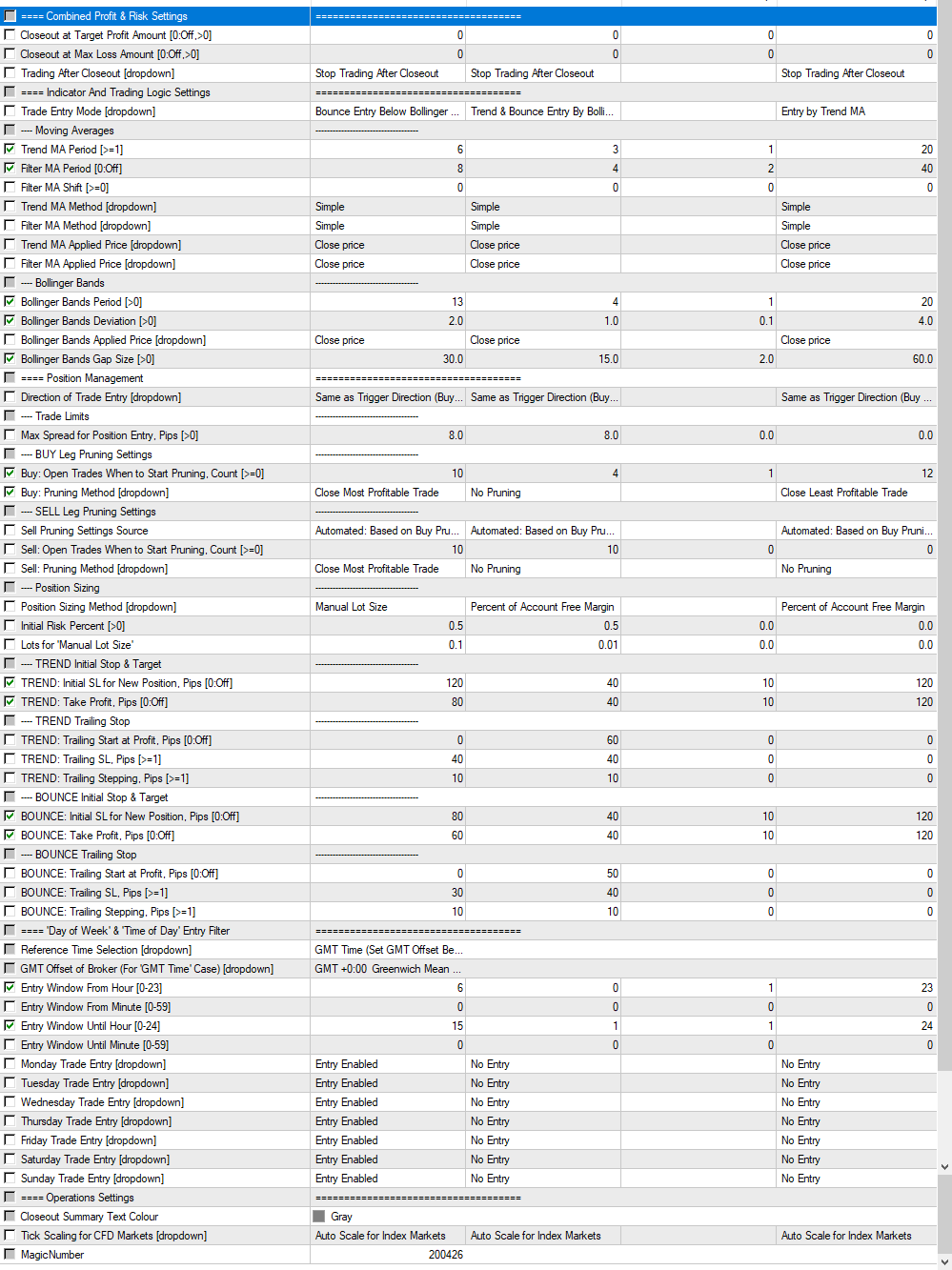 | Leverage | Timeframe | Symbol | Model | Profit | TrendMA_Period | FilterMA_Period | BB_Period | BB_Deviation | BB_GapSize | BUY_MaxTrades | BUY_PruningMethod | T_InitialStopLoss | T_TakeProfit | B_InitialStopLoss | B_TakeProfit | EntryWindow_StartHour | EntryWindow_UntilHour | TargetProfitAmount | MaxLossAmount | TradingAfterCloseout | TradeEntryMode | FilterMA_Shift | TrendMA_Method | FilterMA_Method | TrendMA_Applied | FilterMA_Applied | BB_Applied | TradeDirection | MaxSpread | SELL_Source | SELL_MaxTrades | SELL_PruningMethod | LotSizingMethod | InitialRiskPercent | ManualLots | T_TrailingStart | T_TrailingStop | T_TrailingStep | B_TrailingStart | B_TrailingStop | B_TrailingStep | ReferenceTime | BrokerGMTOffset | EntryWindow_StartMin | EntryWindow_UntilMin | DayOfWeek_Monday | DayOfWeek_Tuesday | DayOfWeek_Wednesday | DayOfWeek_Thursday | DayOfWeek_Friday | DayOfWeek_Saturday | DayOfWeek_Sunday | CFDTickScaling | MagicNumber |