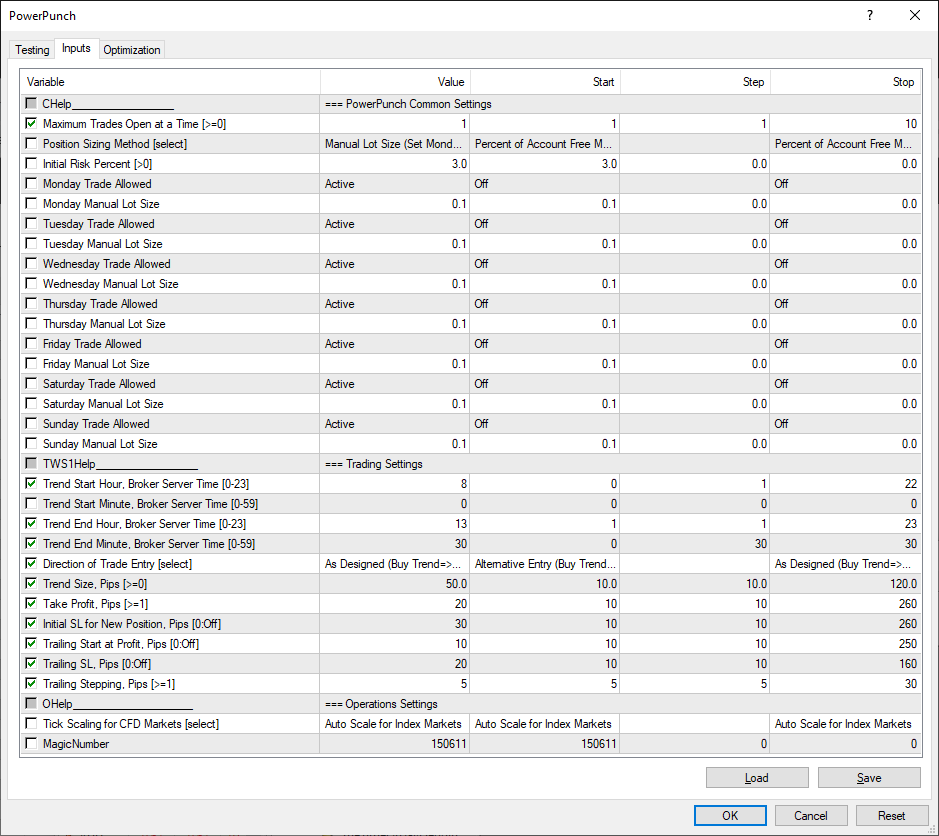 | Leverage | Timeframe | Symbol | Model | Profit | OpenTradesLimit | StartOfTrend_ServerHour | EndOfTrend_ServerHour | EndOfTrend_ServerMin | TradeDirection | TrendSizePips | TakeProfitPips | InitialStopLossPips | TrailingStartPips | TrailingStopPips | TrailingStepPips | LotSizingMethod | InitialRiskPercent | Monday_Trade | Monday_Lots | Tuesday_Trade | Tuesday_Lots | Wednesday_Trade | Wednesday_Lots | Thursday_Trade | Thursday_Lots | Friday_Trade | Friday_Lots | Saturday_Trade | Saturday_Lots | Sunday_Trade | Sunday_Lots | StartOfTrend_ServerMin | CFDTickScaling | MagicNumber |
