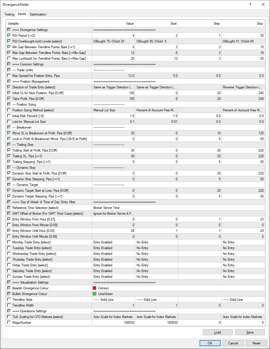 | Leverage | Timeframe | Symbol | Model | Profit | RSI_Period | RSI_OBSLevels | TrendLine_MinGapBars | TrendLine_MaxGapBars | TradeDirection | InitialStopLoss | TakeProfit | BreakEvenProfit | BreakEvenLockin | TrailingStart | TrailingStop | TrailingStep | DynamicStop_Start | DynamicStop_Step | DynamicTarget_Start | DynamicTarget_Step | EntryWindow_StartHour | EntryWindow_UntilHour | TrendLine_MaxLookbackBars | MaxSpread | LotSizingMethod | InitialRiskPercent | ManualLots | ReferenceTime | BrokerGMTOffset | EntryWindow_StartMin | EntryWindow_UntilMin | DayOfWeek_Monday | DayOfWeek_Tuesday | DayOfWeek_Wednesday | DayOfWeek_Thursday | DayOfWeek_Friday | DayOfWeek_Saturday | DayOfWeek_Sunday | TrendLine_Style | TrendLine_Width | CFDTickScaling | MagicNumber |