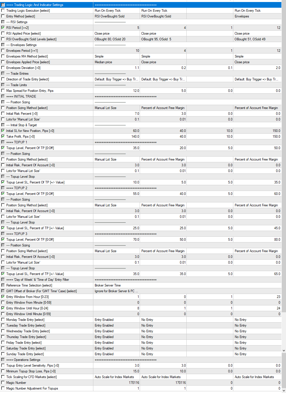 | Leverage | Timeframe | Symbol | Model | Profit | RSI_Period | IT_InitialStopLoss | IT_TakeProfit | TOP1_TopupLevelPct | TOP1_StopLossPct | TOP2_TopupLevelPct | TOP2_StopLossPct | TOP3_TopupLevelPct | TOP3_StopLossPct | EntryWindow_StartHour | EntryWindow_UntilHour | TradingLogicExecution | EntryStrategy | RSI_AppliedPrice | RSI_OBSLevels | Envelopes_Period | Envelopes_MAMethod | Envelopes_AppliedPrice | Envelopes_Deviation | TradeDirection | MaxSpread | IT_LotSizingMethod | IT_InitialRiskPercent | IT_ManualLots | TOP1_LotSizingMethod | TOP1_InitialRiskPercent | TOP1_ManualLots | TOP2_LotSizingMethod | TOP2_InitialRiskPercent | TOP2_ManualLots | TOP3_LotSizingMethod | TOP3_InitialRiskPercent | TOP3_ManualLots | ReferenceTime | BrokerGMTOffset | EntryWindow_StartMin | EntryWindow_UntilMin | DayOfWeek_Monday | DayOfWeek_Tuesday | DayOfWeek_Wednesday | DayOfWeek_Thursday | DayOfWeek_Friday | DayOfWeek_Saturday | DayOfWeek_Sunday | LevelSensitivity | MinTopupStopLoss | CFDTickScaling | MagicNumber | MagicNumberTopupShift |